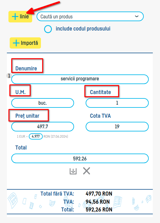 Dacă vrei să adaugi o altă linie pe factură, dă click pe butonul Adaugă o linie și reia procesul de mai sus.