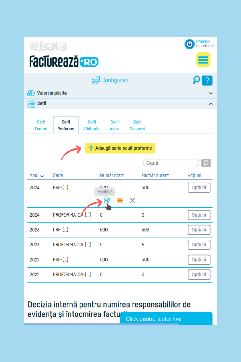 Atenție, poți modifica o serie veche, doar dacă pe seria respectivă nu ai emis documente. Ca să modifici o serie veche, dai click pe iconița “Modifică“, din coloana “Acțiuni“.